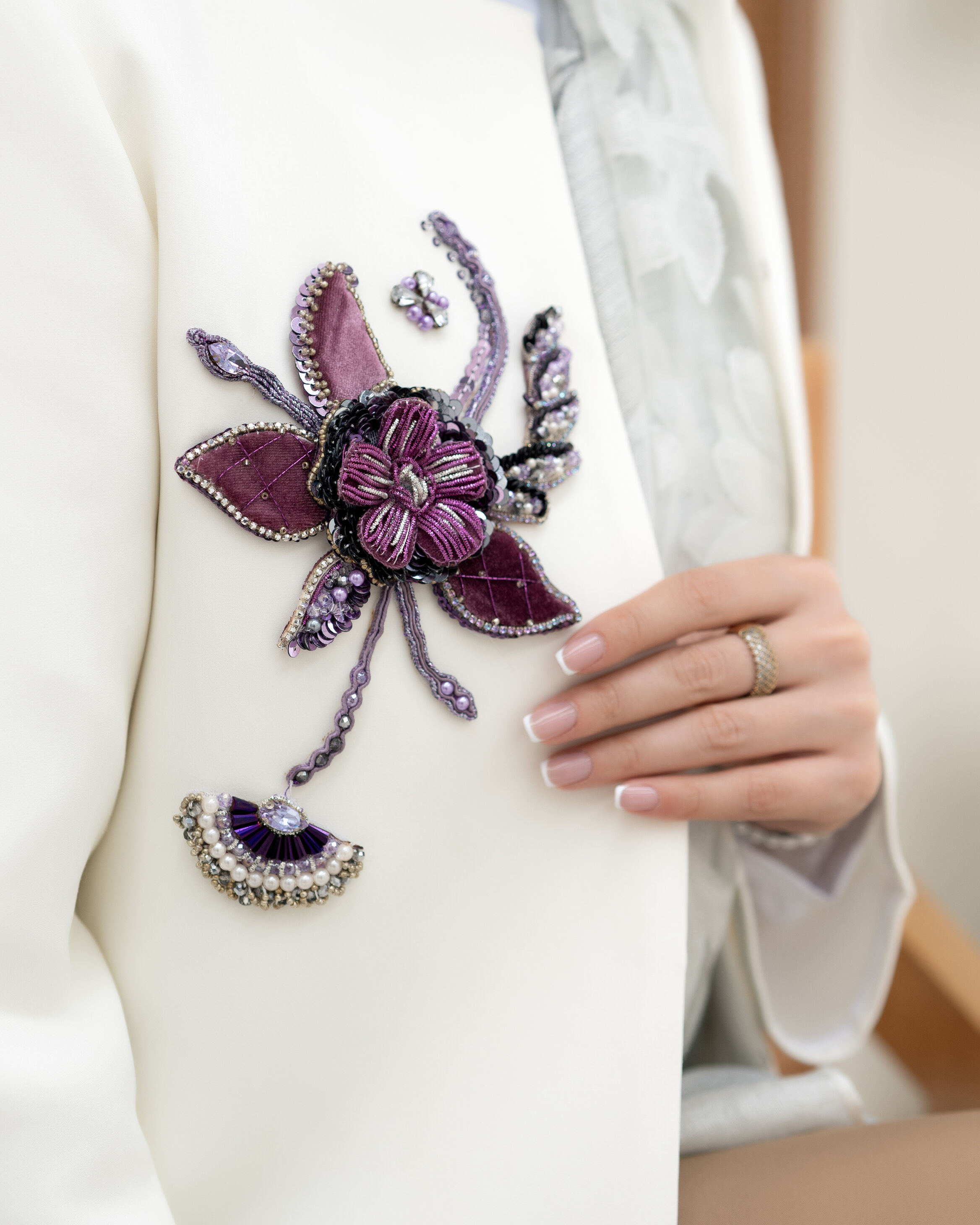 کت جواهردوزی و گلدوزی کرپ سفید و بنفش
