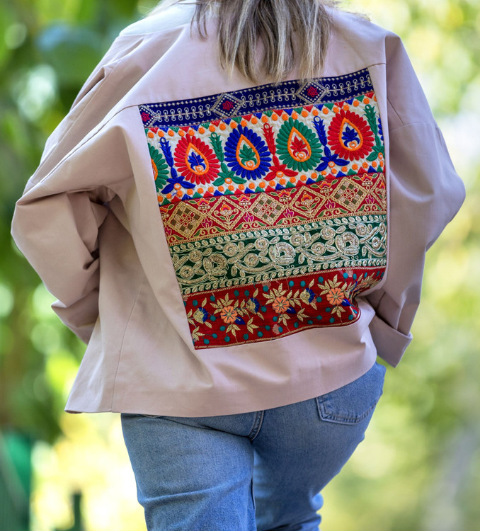 پشت کار پارچه سوزندوزی دارد|جلوی کار گلدوزی با دست دارد|کل کار استرکشی شده