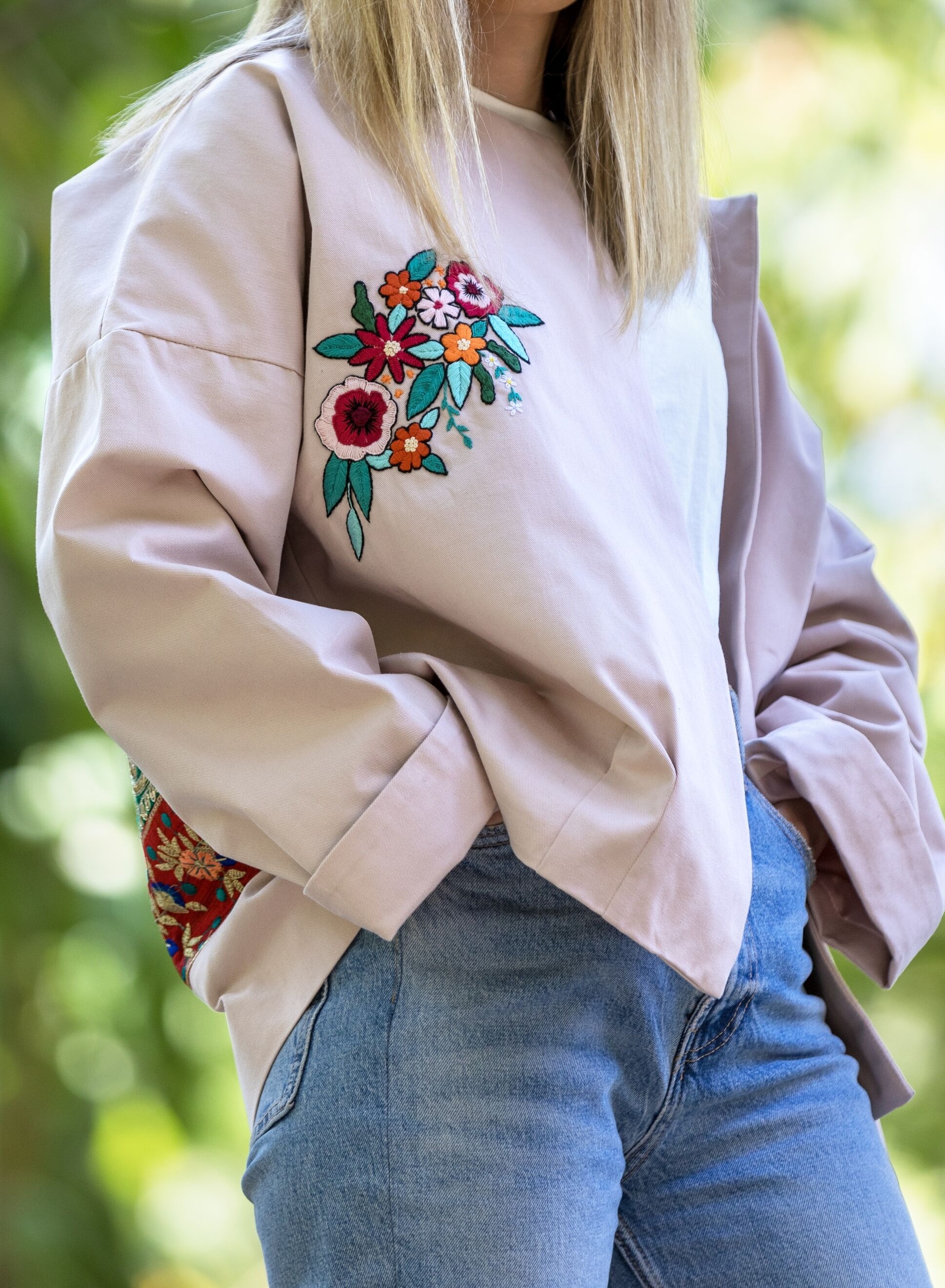 پشت کار پارچه سوزندوزی دارد|جلوی کار گلدوزی با دست دارد|کل کار استرکشی شده